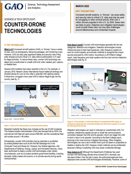 2022年3月25日,美國政府問責(zé)局發(fā)布了《反無人機(jī)技術(shù)報告》(Counter Drone Technologies)。