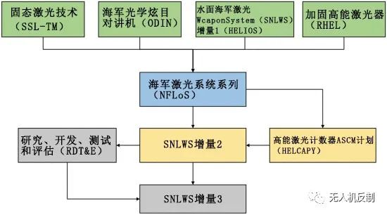 美國海軍主要開發(fā)艦載固態(tài)激光器(SSLs),以提高其對小型艦船和無人機的抵抗力。1977年以來,海軍先后啟動了MIRACL、LaWS、MLD、MK38-TLS、LWSD等一系列研究計劃。正在進(jìn)行的主要項目是SNLWS系列計劃和“NLFoS”系列計劃,圖顯示了它們的關(guān)系。