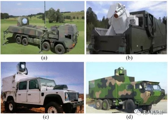 在歐洲,德國是HELW最早、技術(shù)最先進(jìn)的國家之一。它早在1970年代就啟動了實戰(zhàn)的“HELEX”計劃。目前德國HELW的研發(fā)主要以Rheinmetall防務(wù)和MBDA Deutschland為主。萊茵金屬防御公司在2012年成功測試了50千瓦的“天空衛(wèi)士”,這是當(dāng)時最強大的HELW之一。目前,萊茵金屬防務(wù)已經(jīng)在德國建立了無人機防務(wù)中心。其組合的“工具箱”作戰(zhàn)模型可以更具體地應(yīng)對各種情況下的無人機威脅。MBDA Deutschland將激光視為反無人機的最佳方式,早在2009年就提出了AD-HELW項目。它于2011年成功開發(fā)了10kW HELD,并針對四旋翼無人機等高動態(tài)飛行目標(biāo)進(jìn)行了實際測試。最近,它開發(fā)了一種具有中程反無人機能力的100kW GBMLE,如圖7(a)所示。此外,兩家公司正在聯(lián)合開發(fā)專門用于反無人機任務(wù)的10-20kW HELW演示器,并于2021年將其集成到K130護(hù)衛(wèi)艦中。俄羅斯也是HELW研發(fā)的先驅(qū)。其Almaz-Antey公司在1980年代開發(fā)了HEL DEW,并在實驗中成功擊落了一架大型固定翼無人機。Peresvet是俄羅斯最先進(jìn)的激光武器,也是世界軍隊中唯一的現(xiàn)役HELW,如圖7(b)所示。它于2018年底開始作戰(zhàn)任務(wù),并于2020年6月在敘利亞西南部的一次作戰(zhàn)行動中擊落了一架以色列無人機。許多其他歐洲國家也計劃將激光反無人機武器集成到主動防空系統(tǒng)中。例如,英國在2017年展示了其50kW Dragonfire,于2019年完成了現(xiàn)場試驗,并計劃在2023年將其部署到皇家海軍。此外,愛沙尼亞的Shark和丹麥的Anti-Drone是具有HEL攔截能力的綜合反無人機系統(tǒng)。