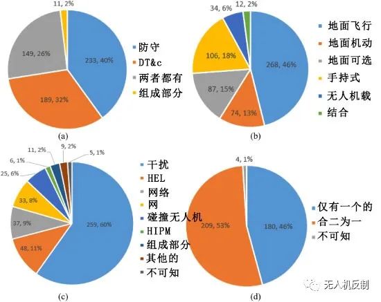 圖10展示了全球反無人機系統(tǒng)在作戰(zhàn)能力、作戰(zhàn)平臺、攔截技術(shù)、組合方式等方面的數(shù)據(jù)統(tǒng)計。圖10(a)顯示,68\%的武器具有主動防御能力,其中40\%只能防御,26\%兼具防御和探測、跟蹤、分類能力,2\%配備防御組件。從圖10(b)可以看出,大部分武器(74\%)是陸基的,集成方式主要是固定的(46\%)。以無人機為作戰(zhàn)平臺的機載武器發(fā)展相對薄弱,僅占6\%。圖 10(c)表明電子對抗是目前主要的主動防御技術(shù)(69\%),其中干擾是最常用的(60\%),甚至超過所有其他技術(shù)的總和。定向能對抗目前占比較低,僅為12\%,成本高是制約其數(shù)量的主要因素。然而,它是所有主動防御技術(shù)中最有前途和發(fā)展最快的一種。物理對策約占14\%,低于實際值,因為不包括幾乎無法統(tǒng)計的項目和老鷹。圖10(d)顯示,當(dāng)今大多數(shù)武器(53\%)仍依賴單一技術(shù),只有不到一半(46\%)具有多樣化的主動防御能力。