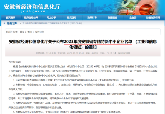 圖為網(wǎng)站公布專精特新中小企業(yè)名單截圖