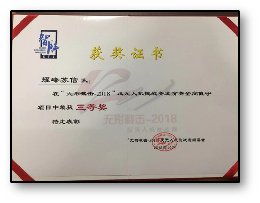 2018年10月,在由中央軍委科技委主辦、公安部裝備財(cái)務(wù)局協(xié)辦的“無(wú)形截?fù)?/span>-2018”反無(wú)人機(jī)挑戰(zhàn)賽進(jìn)階賽全向值守項(xiàng)目中榮獲第二名(三等獎(jiǎng)),得到軍委科技委和公安部裝財(cái)局專家的一致好評(píng)。