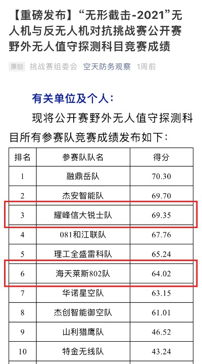 2021年7月10日至25日,“無形截?fù)?/span>-2021”無人機(jī)與反無人機(jī)對(duì)抗挑戰(zhàn)賽在內(nèi)蒙古自治區(qū)阿拉善盟左旗051基地舉行,共計(jì)105支隊(duì)伍參加比賽。憑借精準(zhǔn)的目標(biāo)識(shí)別和穩(wěn)定的跟蹤性能,“耀峰信大銳士隊(duì)”在野外無人值守探測科目中表現(xiàn)優(yōu)異,奪得第三名, “耀峰探測隊(duì)”在城區(qū)單目標(biāo)探測科目中取得第八名。母公司合肥海天科技率“海天萊斯802隊(duì)”奪得野外無人值守探測科目第六名。此外,耀峰雷達(dá)保障多支參賽隊(duì)伍完成比賽。